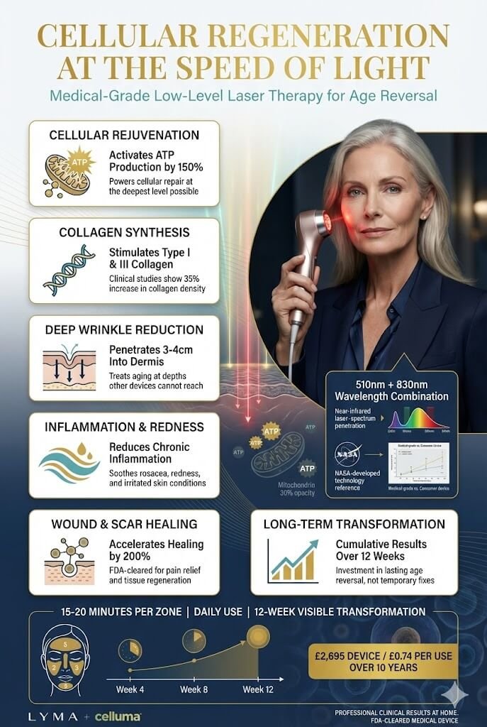 This medical-grade cold laser combines 808 nm near-infrared and 620 nm red light to deliver 500 mW of power through an 8 cm² treatment lens. A patented ultra-diffuse lens disperses the beam 25,000 times to eliminate heat while maintaining full biological effectiveness. Clinical research shows a 103% increase in skin elasticity within 30 days and activation of 45 genes linked to skin regeneration. Penetrating 8–15 mm deep into fat and muscle tissue, the laser communicates directly with mitochondria to accelerate collagen and elastin production by up to 400% without thermal damage.