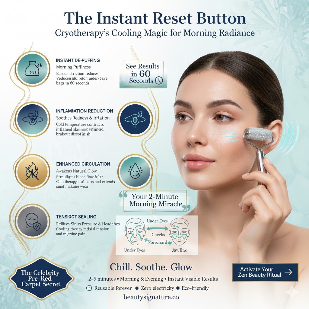 Store in freezer always. Use after applying serums to seal them in. Roll for 5-10 minutes in upward, outward motions. Perfect post-workout, after flight, or for morning de-puffing. Wrap in tissue if too cold. Can be used multiple times daily—safe for daily use.