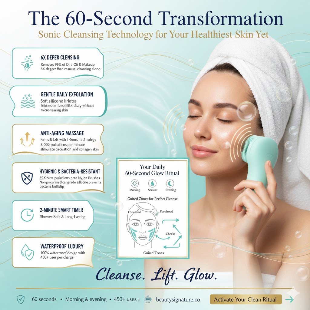 Use for 1 minute, twice daily with cleanser. The device vibrates to guide you through facial zones. Cleansing mode (AM/PM), firming massage mode (PM only). Fully waterproof—use in shower. Charge lasts 365+ uses. Rinse after every use; deep clean weekly with antibacterial soap. Pairs perfectly with any cleanser.