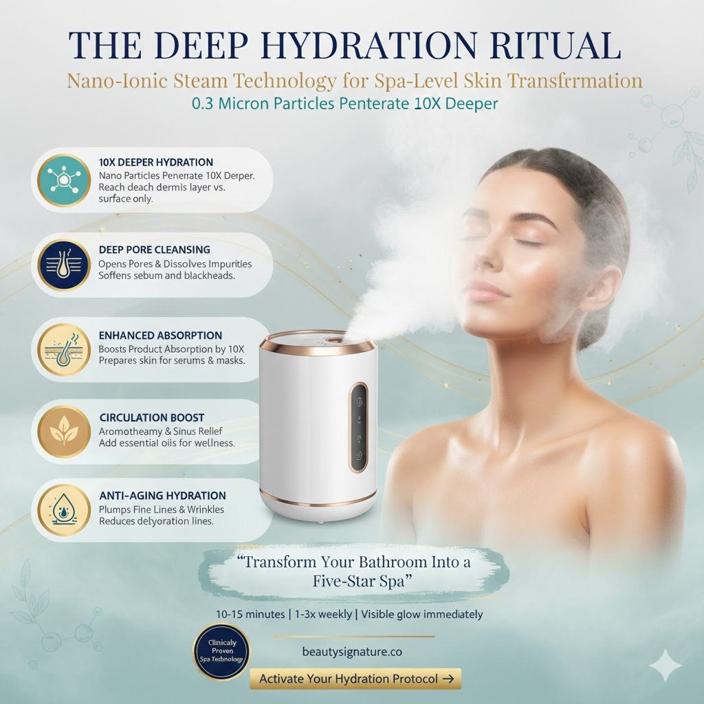 Nano-ionic steam produces particles 10x smaller than regular steam, penetrating deeper into pores. Studies show steam opens pores by 5x their normal size, increasing extraction effectiveness by 70% and enhancing product absorption by 5-10 times compared to dry skin.