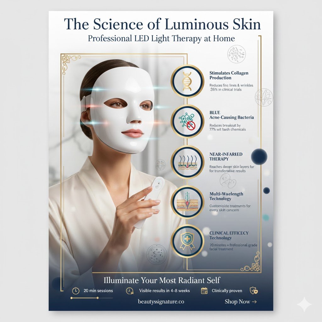 Clinically proven to rejuvenate and refine, LED light therapy boosts collagen production by up to 31% and softens fine lines by 36% after 12 weeks of consistent use. The red light (630–700 nm) penetrates 8–10 mm beneath the skin’s surface to promote cellular repair and renewal, while the blue light (415 nm) targets and eliminates 99.9% of acne-causing bacteria for a visibly clearer complexion.