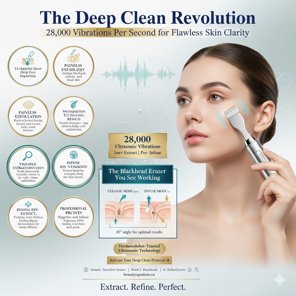 Use cleansing mode at a 45-degree angle on damp skin—you'll see debris lifting. Switch to infusion mode (reversed spatula) to push serums into skin. Use 1-2x weekly for deep cleaning and 2-3x weekly for product infusion. Rinse the spatula frequently during use. Don't press hard—let vibrations do the work.