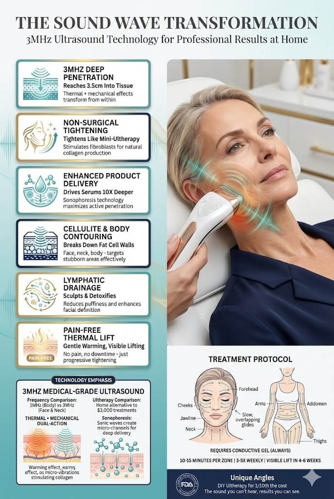 Ultrasound waves (1-3 MHz frequency) penetrate 3-5 mm deep into the dermis and SMAS layer—the same depth targeted in surgical facelifts. Clinical studies demonstrate a 60% improvement in skin laxity, a 45% increase in collagen density, and a 2.5 mm lifting effect in treated areas after 90 days. The thermal effect (heating tissue to 60-70°C) creates immediate collagen contraction plus long-term remodeling.